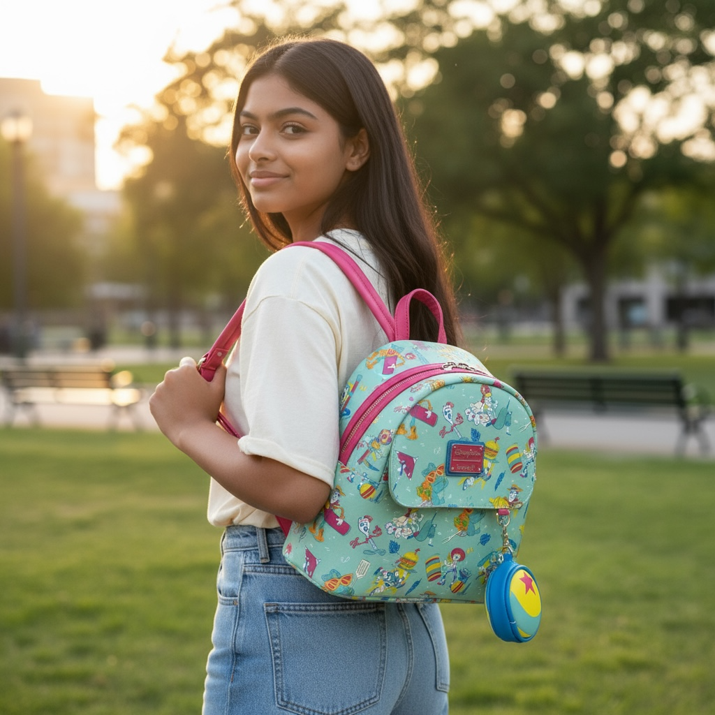 Bring the playful spirit of Toy Story wherever you go with this two-piece set, featuring a vibrant mini backpack and matching coin purse. Crafted from high-quality simulated leather, the backpack bursts with a cheerful allover print starring fan favorites like Woody, Buzz Lightyear, Jessie, Bo Peep, Rex, Forky, Ducky, Bunny, and the lovable Space Alien.
